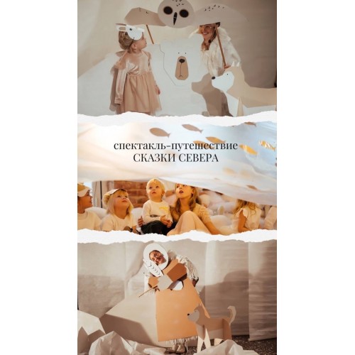 Камерная история о сотворении мира и тайных северных земель. Голоса ветров, полярное сияние, живая музыка и обитатели заснеженного Севера - медведи, олени, совы и киты - оживают на сцене и рассказывают свои древние сказания. Самый масштабный спектакль проекта: натуральные декорации, экологичный подход и живое звуковое сопровождение - шаманский бубен, варган, диджериду, глюкофон и шумы стихии. После спектакля тематический мастер-класс для детей.