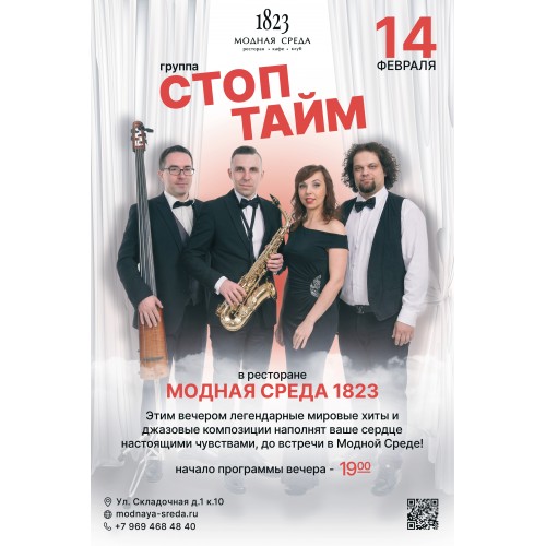 Группа "Стоп тайм" открывает вечер в день всех влюбленных в ресторане "Модная среда 1823" исполнением мировых хитов и лучших джазовых композиций. В 21.00 вечер продолжится театрально-поэтическим вечером "Любофф". Приобретенные билеты действительны на все мероприятия этого вечера.