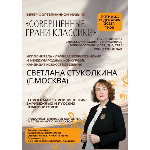 Пианистка, лауреат международных конкурсов, кандидат искусствоведения Светлана Стуколкина приглашает всех любителей классической музыки на свою новую программу "Совершенные грани классики". Концерт состоится в пятницу, 12 декабря 2025г., в Доме-Музее Марины Цветаевой. В программе прозвучат произведения Моцарта, Шуберта, Шопена, Бородина, Скрябина.С
