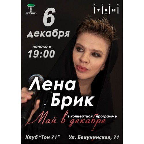 Что, если можно вернуть ощущение солнечного мая в холодный декабрьский вечер? Лена Брик представляет свою долгожданную программу «Май в декабре» — музыкальный рецепт от хандры и идеальный повод для встречи с собой и близкими по духу.