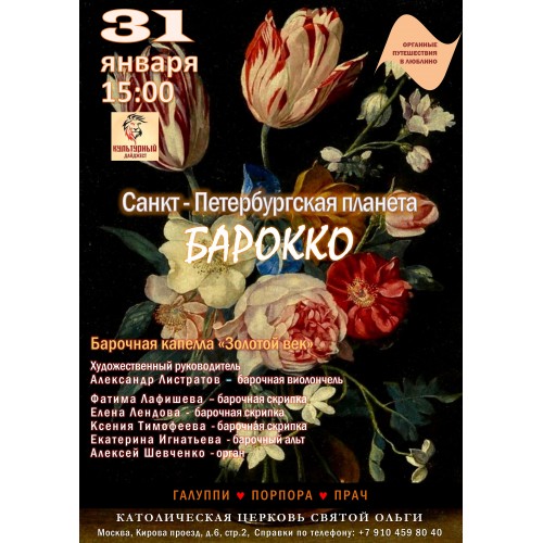 Солисты барочной капеллы "Золотой век" представят уникальную программу, показав всё грани санкт-петербургского барокко. Музыканты будут играть на аутентичных старинных инструментах с жильными струнами, чтобы максимально приблизиться к атмосфере того времени, а мерцание свечей усилит этот эффект.