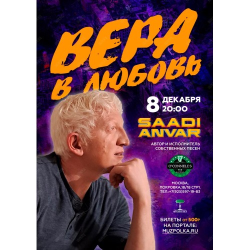 Приглашаем вас на незабываемый творческий вечер автора и исполнителя собственных песен SaadiAnvar – виртуоза, чья музыка способна тронуть сердце и душу. Этот вечер обещает стать настоящим праздником для любителей живого звука и оригинального творчества.