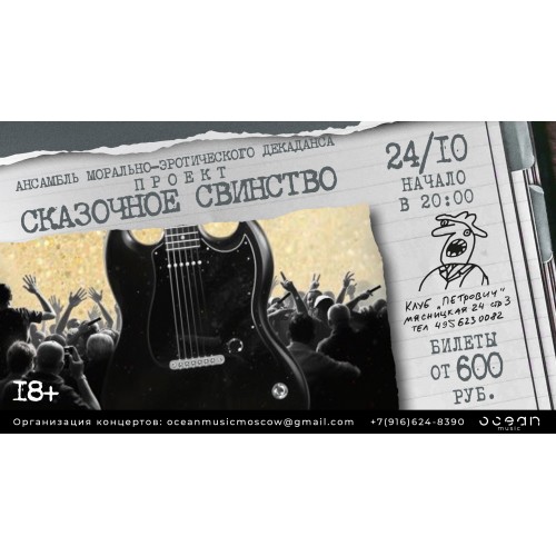 Ансамбль морально-эротического декаданса "Сказочное свинство" создан для поддержки отечественной поэтической потенции. Группа делает упор на интеллектуальность текстов, при этом оставаясь в традициях русского бесшабашного рока. Творчество музыкантов полностью соответствует названию группы и часто отражает их образ жизни. Состав группы: Сергей Радченков - вокал, гитара, Дмитрий Терентьев - гитара, Сергей Шрекос - бас-гитара, Никита Радченков - ударные.