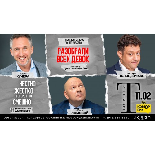 Смех с первой до последней минуты, юмор «на грани», честный и жёсткий мужской взгляд на отношения. И конечно-же – признание в Любви! Большая Смешная Премьера – комический спектакль «Разобрали Всех Девок», по одноимённой книге «лирических» стихов НЕпоэта Ломового Точные, острые фельетоны «о любви», набравшие миллионы просмотров в социальных сетях, обретут второе дыхание и оригинальное прочтение – ведь со сцены их продекламируют всем известные и любимые всеми актёры - Оскар КУЧЕРА и Михаил ПОЛИЦЕЙМАКО. Зрителей ждут 100 минут юмора, актёрского таланта, непрерывного смеха и удовольствия, в сочетании с оригинальными режиссёрскими решениями, фирменным саунддизайном и эффектной видеопрограммой. Премьера приурочена к выходу в свет сатирического стихотворного сборника «Разобрали всех Девок», куда войдут избранные произведения «о любви», написанные в период 2013-2026 гг. Лучшие и самые смешные – 11 февраля прозвучат со сцены Театра на Страстном в исполнении любимых актёров. Это будет Жёстко, Честно и Невероятно Смешно. Строго 18+