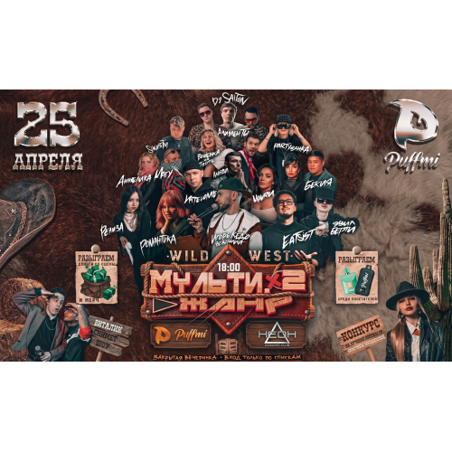 Наши вечеринки запоминаются тем, кто на них бывает и люди возвращаются! Каждая вечеринка сопровождается выступлением участников всероссийского музыкального проекта Мультижанр, а гости приходят в костюмах по текущей тематике, в этот раз - Дикий Запад. А после основной программы, гости смогут попеть в караоке, что тоже создаёт особую атмосферу продолжения вечера.